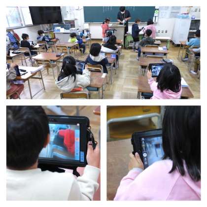 今日は、1年生がタブレットのカメラ機能を使っていました。カメラ機能は、観察の記録など、1年生が効果的に使える機能のひとつです。電源の入れ方、ログインの仕方から教えて、今では子どもたちが自分でタブレットを立ち上げ、カメラ機能を立ち上げることができるようになっています。