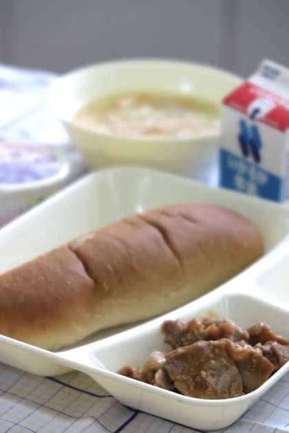 今日の献立は【豚肉のデミグラスソース・スープ・ぶどうゼリー・黒糖パン・牛乳】です。