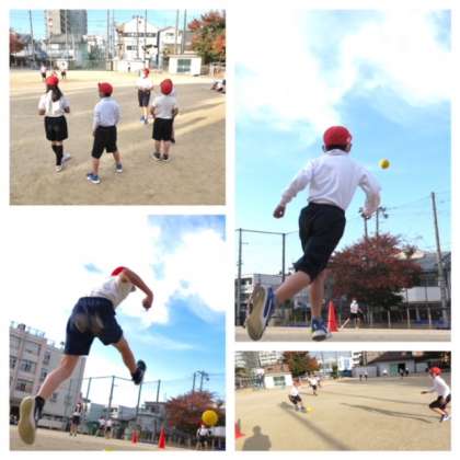 4年生は、今日もキックベース型ゲームをしました。チームでどちらに蹴ったらいいか作戦を立てたり、友達のファインプレーをみんなで喜んだり、とても良い雰囲気です。子どもたちがゲームの特性をよく理解しており、コーンを置く位置や守備位置など、状況に応じた作戦を立てることができています。