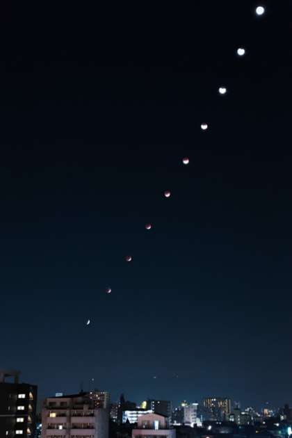 11月19日は、夕方より部分月食の観察ができました。小路小学校の屋上で15分ごとに固定撮影した画像を、1枚に重ねてみました。月の動きと、月の形の変化がよくわかります。