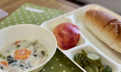 献立は【きのこのクリームシチュー・きゅうりのバジル風味サラダ・りんご・おさつパン・牛乳】です。
