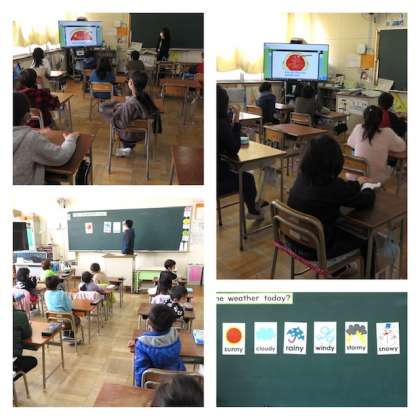 1年生は、明日の天気を予想して、英語で表現します。「It's sunny.」といった天気を表す表現を習いました。どんな活動でも元気いっぱいの一年生。英語の学習でも、大きな声で元気よく発言します。