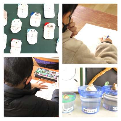 教室には、生活科で観察したクロッカス、ヒヤシンス、スイセンの球根がありました。水につけて置いてあり、これからの成長の様子を観察します。