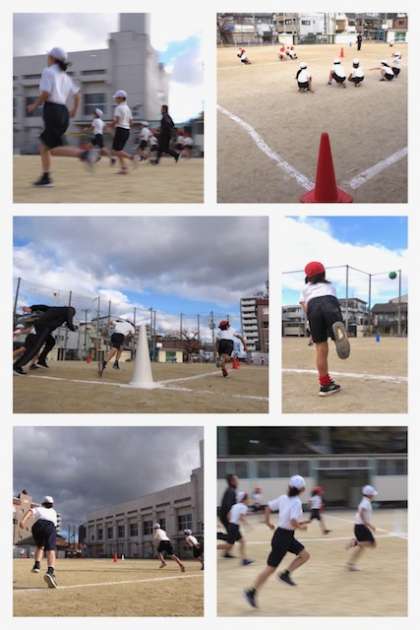運動場に降りてみると、1a(アール)がどれぐらいの広さかを確かめる学習をしていました。描いた1aのコートを歩いたり走ったりしながら広さを実感します。その後、このコートを使ってドッジボールをしました。1a、1ha(ヘクタール)という単位は子どもたちには実感を伴ってイメージすることが難しいのですが、4年生の子どもたちは1aがどのくらいの広さか、具体的にイメージできるようになったと思います。