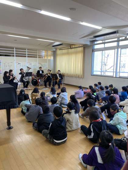 学校にプロの演奏家のみなさんを招き、音楽鑑賞会を行いました。各学年、30〜40分ほどの短い時間でしたが、日頃音楽の授業で学習している曲や知っている曲、