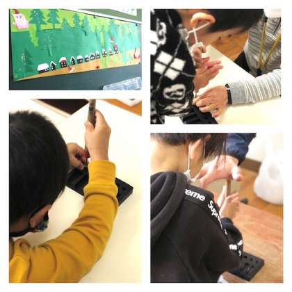 1年1組が、生活科の時間に「どんぐりを使ったコマ」を作っていました。錐(きり)をつかうので、子どもたちも慎重に取り組んでいました。手作りのおもちゃの完成、楽しみですね。