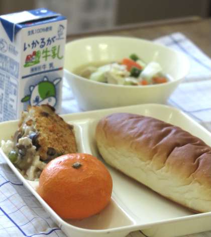 12/15の献立は【鶏肉とじゃがいものスープ煮・きのこのドリア・みかん・おさつパン・牛乳】です。
