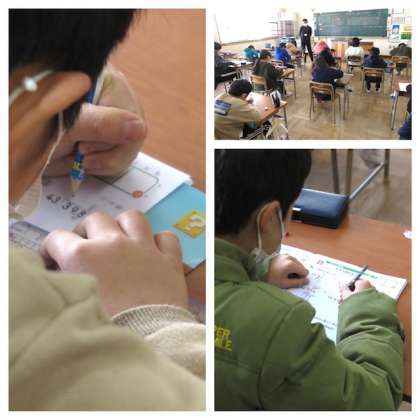 4年1組が算数の学習をしていました。先生の板書がとても丁寧です。子どもたちは、板書を写し終えた後、練習問題に取り組んでいましたが、丁寧に書いている子がとても多かったです。筆算の時にものさしを使うのはとても大切で、丁寧に書くことでミスが減り、あとから間違いにも気づきやすくなります。丁寧に書くこと、数字に現れませんが、これも身につけさせたい大切な学力のひとつです。