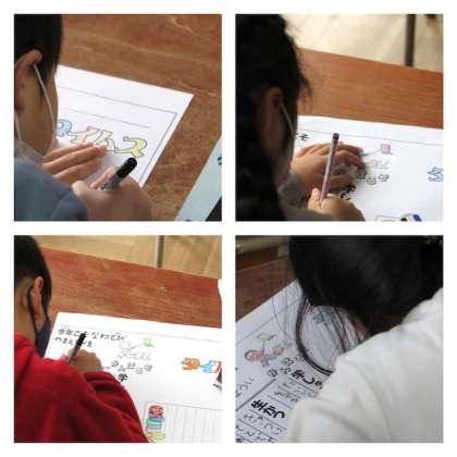 1年生は、新年の目標を新聞形式のプリントに書いています。とても丁寧な字で書いており、子どもたちの「がんばるぞ!」という意欲が伝わってきます。イラストの色塗りもとても丁寧で、集中して取り組んでいました。ぜひご家庭でも、「今年は何をがんばるの?」と子どもたちの抱負を尋ねてあげてください。