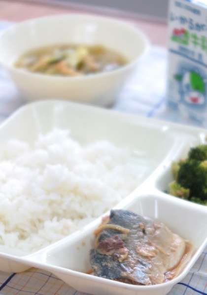 今日の献立は【さばのみそ煮・五目汁・ブロッコリーのごまあえ・ごはん・牛乳】です。