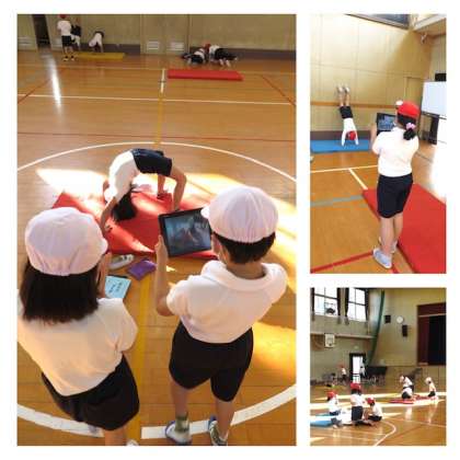 2年生は、体育の時間に「マット運動」の学習をしています。先日、研究授業を行った続きに取り組んでいます。