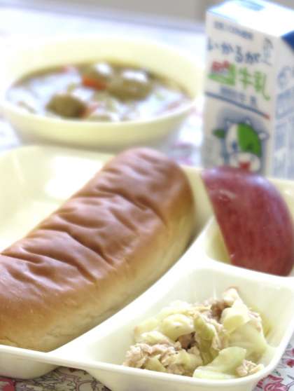 ?今日の献立は【ミートボールと野菜のカレー煮・ツナとキャベツのソテー・りんご・こくとうパン・牛乳】です。