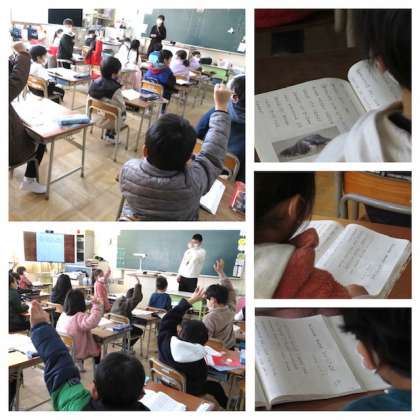 1年生は、国語の時間に「子どもを まもる どうぶつたち」という説明文の学習をしています。1年生の子どもたちは、よく手をあげて発表しています。友達の意見をよく聞き、同じ考えの場合は「グー」をあげて同じ考えである意思表示をしていますが、こうした話し合いの時のルールもしっかり身について来ています。