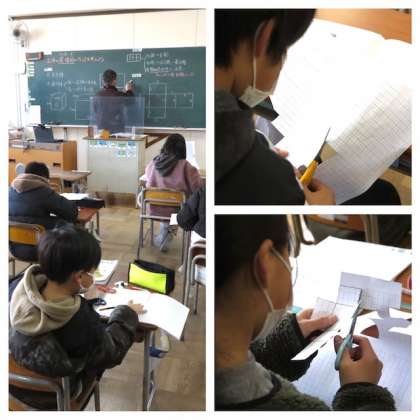 3年生は、算数の時間に三角形の学習をしています。コンパスを使って二等辺三角形を、かく練習をしていました。