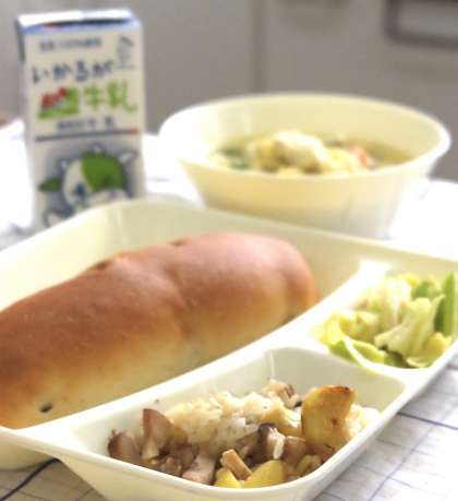今日の献立は【中華おこわ・卵スープ・キャベツのオイスターソースいため・レーズンパン・牛乳】です。
