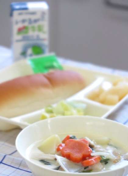 今日の献立は【ほうれん草のクリームシチュー・キャベツのサラダ・洋なし(カット缶)・コッペパン・マーガリン・牛乳】です。