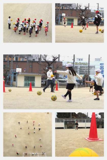ボールを拾いに行くのも体育の学習。ボールを蹴るだけでなく、運動量も確保することができます。子どもたちは、とても楽しそうに運動していました。