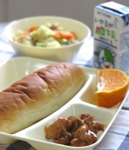 今日の献立は【鶏肉のみそバターソース・洋風煮・デコポン・おさつパン・牛乳】です。