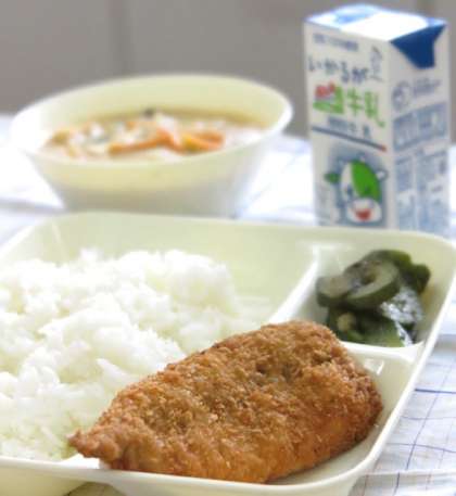 今日の献立は【いわしフライ・みそ汁・きゅうりの赤じそあえ・ご飯・牛乳】です。