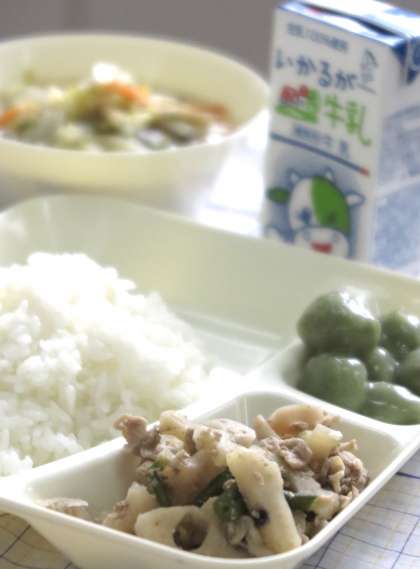 3/4の献立は【豚肉とれんこんの炒め煮・五目汁・きなこよもぎだんご・ごはん・牛乳】です。
