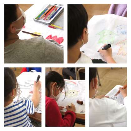 1年生は、図工の作品を持ち帰る作品袋に、色鉛筆やサインペンなどで飾り付けをしていました。
