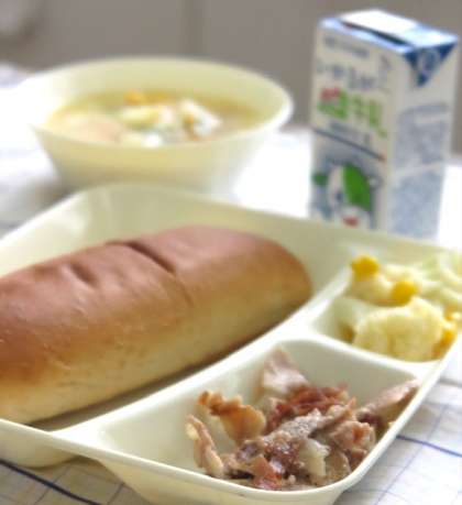 今日の給食は【豚肉のガーリック焼き・スープ・カリフラワーとコーンのサラダ・こくとうパン・牛乳】です。今年度、最後の給食、美味しくいただきました。