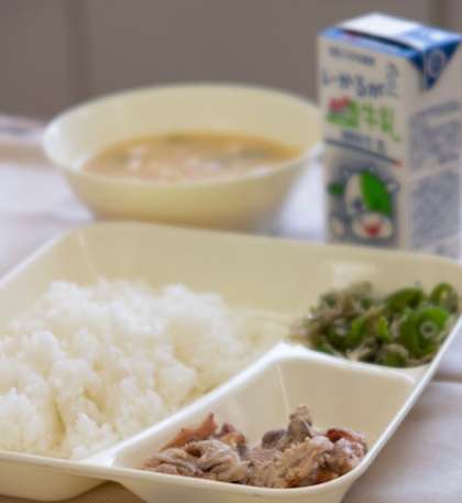 1年生にとって初めての米飯の提供です。じゃこピーマンは、ピーマンがとても柔らかく、ちりめんじゃこのうまみと合わさって、ピーマンが苦手な児童でも食べやすく工夫されています。