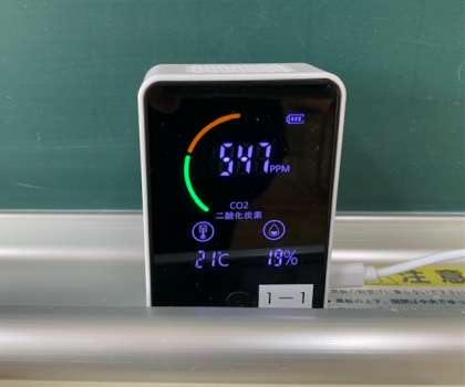 昨年度はCO2モニターを導入し、いろいろな場面で換気が保たれているかを測定していましたが、今年度は各学級教室にもCO2モニターを設置しました。