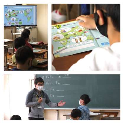 世界各国のあいさつを聞き、その後、「Hello. I'm〜. I like 〜.」という会話の学習をしました。児童一人と先生がまずはお手本。その後、ペアの友達と練習しました。