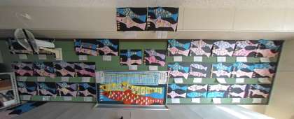 3年生の教室の後ろには、図工の作品がたくさん掲示されていました。ひとクラスの人数が増えると、掲示物を貼った様子も壮観です。