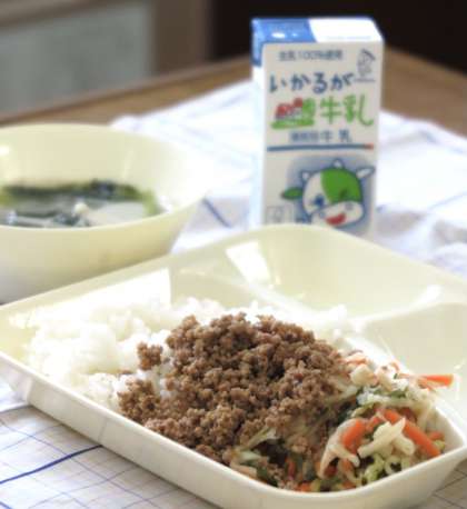 今日の献立は【ビビンバ・トック・牛乳】です。すっかりおなじみの韓国・朝鮮の料理ですが、野菜もたっぷり摂ることができるのが良いですね。子どもたちに人気のメニューです。
