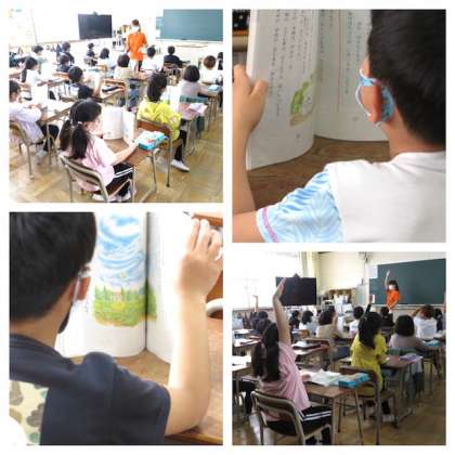 最初に一人一人が小さな声で音読をして、読みを深めます。文章を覚えてしまうくらいに音読を繰り返すと、子どもたちの理解が深まります。学校での学習、宿題以外にも、家庭で音読や視写(文章をよく見ながらまちがいなく書き写す学習)をするよう、子どもたちに勧めていただければと思います。