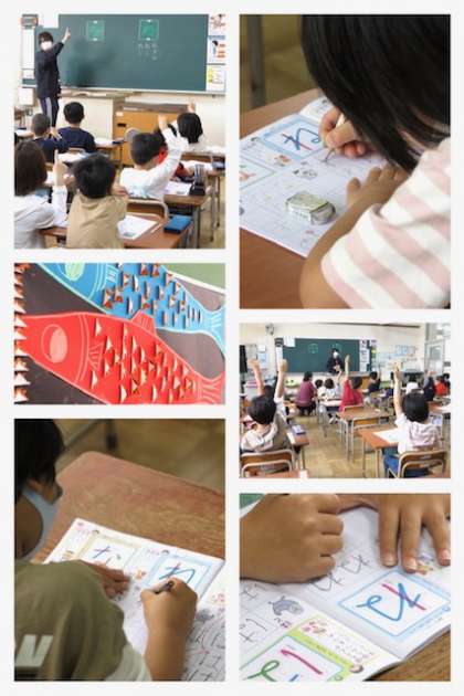 1年生は、国語の時間に「ひらがな」の学習に取り組んでいました。今日、学習したのは「ね」と「な」です。どちらも、最後にくるっと回る共通した書き方をする文字です。練習前に、「ね」や「な」のつく言葉を発表しましたが、手をぴんと伸ばす姿に子どもたちの意欲が伝わってきました。