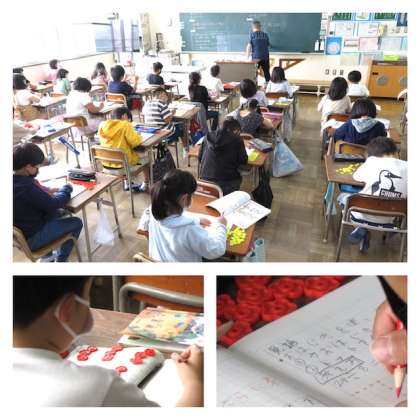 おはじきは、具体物を操作するため、低学年の学習ではとても有効です。でも、いつもおはじきが使える環境があるとは限りません。また、学年が上がるほど、具体物の操作をする時間もありません。そこで、おはじきがない場合にどのように工夫ができるかを考えました。