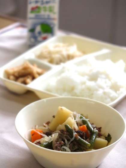 今日の献立は【肉じゃが・もやしのゆずの香あえ・ごまかかいため・ごはん・牛乳】です。
