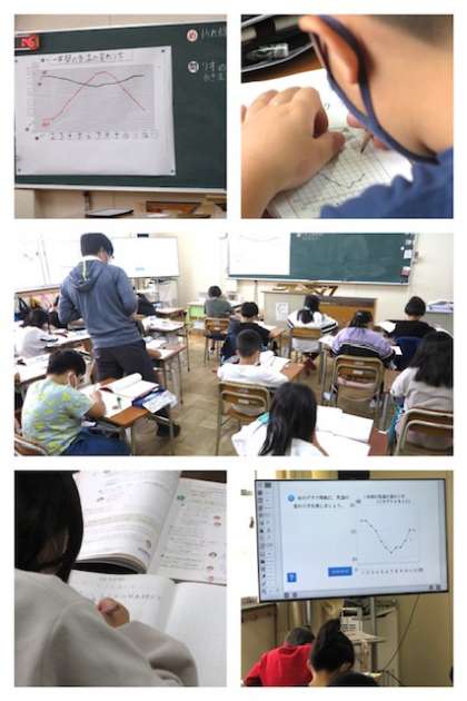 4年生は、算数の時間に「折れ線グラフ」のかき方について学習しています。今日は、日本とブラジル リオデジャネイロの気温を比較する折れ線グラフを作成しました。北半球と南半球で気候が反対になるため、折れ線グラフの線の形が大きく異なり、そこから特徴を読み取るうえでも良い題材でした。