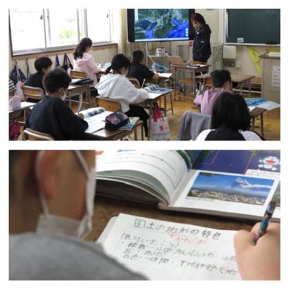 5年生は、社会科で日本の国土の特徴について学習しています。今日は航空写真を見ながら、平地や山地の分布や、土地利用の様子によって、見える色も異なることなどに気づくことができました。5年生は、よく手を挙げて発表する姿が印象的でした。