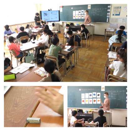 5年生は、外国語の時間に英語の聞き取り能力を高めるゲームをしていました。いろいろな色について英語でどのように呼ぶかを学んだ後、「blue」と言った時だけ二人の間にある消しゴムを取るという、聞き取りと反射神経を競うゲームです。「brown」には、かなりの子がひっかかっており、子どもたちが集中して取り組んでいる様子がよく伝わってきました。