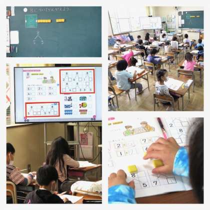 1年生は、算数の学習で「8」という数字について学習をしました。8という数字がどのくらいの量になるか、数量関係をしっかり掴んでおく必要があります。そこで、おはじきを使って、「5と3」に分けられることを学び、その後、「2と6」、「1と7」などにも分けられることを、おはじきで確かめました。