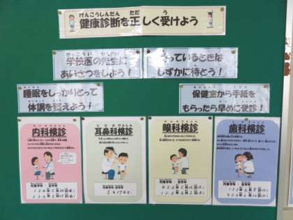 保健室前には、2種類の掲示物が掲出されています。ひとつは「健康診断について」、もうひとつは「正しい生活習慣について」。