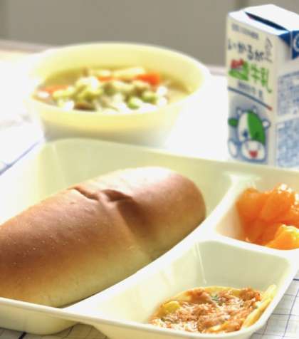 今日の献立は【豚肉と野菜のカレースープ煮・変わりピザ・みかん(缶)・黒糖パン・牛乳】です。