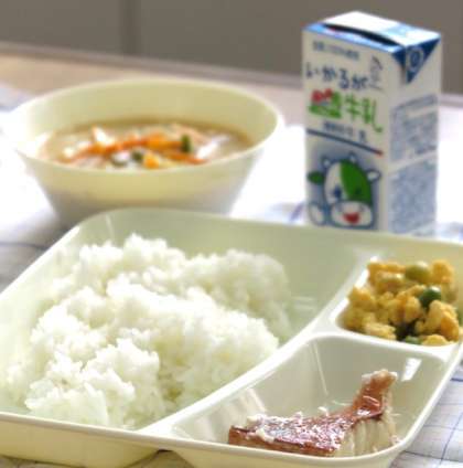 今日の献立は【あかうおのしょうゆだれかけ・みそ汁・えんどうの卵とじ・ごはん・牛乳】です。