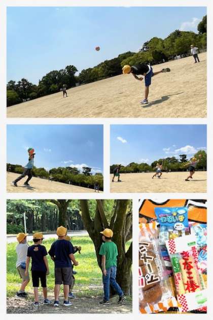 おやつを食べ終えて、また遊び始めた子どもたち。長居の陸上競技場ぐらいはあろうかという、とても広大な広場ですが、小路小学校の貸切状態です。子どもたちは、食後ものびのびと過ごしています。