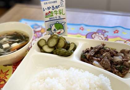 今日の献立は【プルコギ・とうふとわかめのスープ・きゅうりの甘酢づけ・ごはん・牛乳】です。
