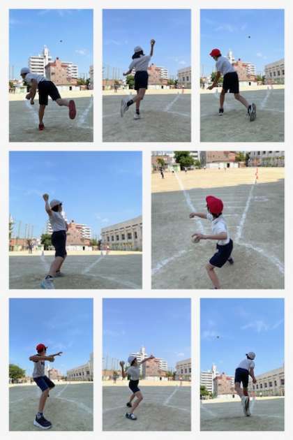 6年生は、ソフトボール投げをしました。さすがは6年生、高く飛ばすようにアドバイスをすると、しっかりそのアドバイスを生かしてきます。友達を応援する態度、測定がスムーズに進むように協力する態度、とても立派でさすがは6年生と感心しました。