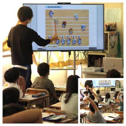 1年生は、算数の時間に数字の学習をしています。順位を表す数字がどれになるかを学習しました。写真に写っているのは、デジタル教科書と言います。子どもたちの教科書に載っているものと同じ図が映し出され、線を引いたり、一部を拡大したり、学習をサポートする機能がついています。