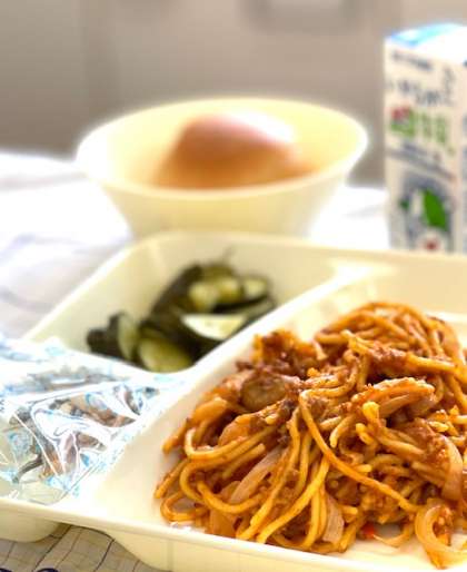 今日は子どもたちが大好きなスパゲッティミートソースです。炭水化物の献立ですが、そこにパンがついてきます。