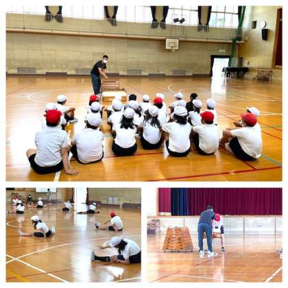 4年生は、体育の時間に跳び箱の学習をしました。跳び箱の準備の仕方から、丁寧に教わります。跳び箱には事故を防ぐために守らなければならないポイントがいくつかあります。それらひとつひとつを確かめながら、準備や練習に取り組みました。