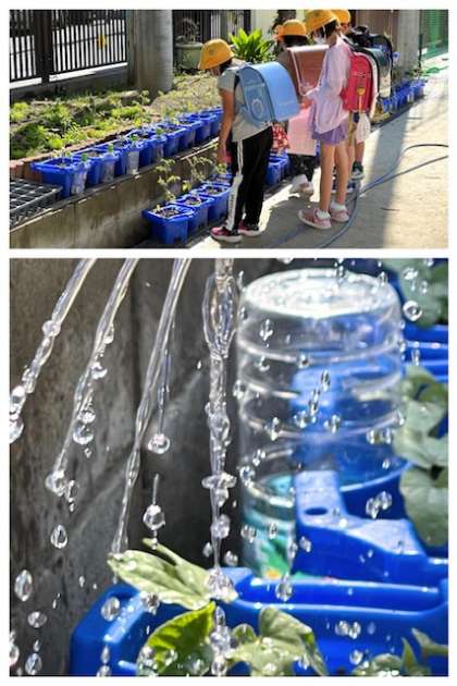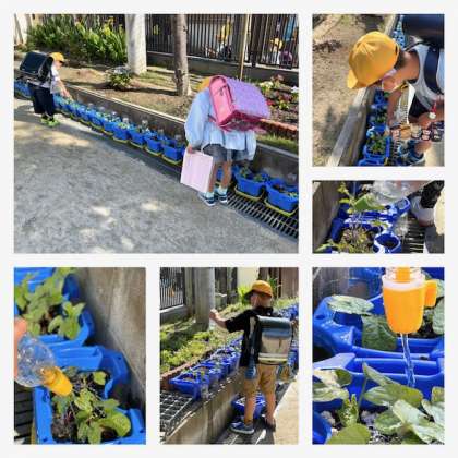 今日も1・2年生が、登校後に水やりに励みます。しっかり水やりをやってきたおかげで、2年生のミニトマトは花が咲き、小さな青い実も実ってきています。1年生のアサガオもすくすくと育ち、葉の枚数も増えてきました。