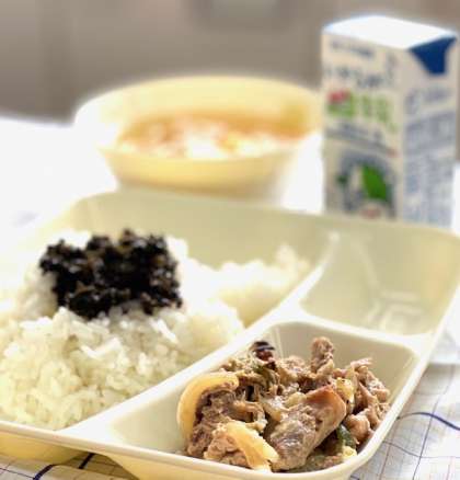 今日はごはんによく合う「豚肉のごまみそ焼き」と「のりのつくだ煮」です。「のりのつくだ煮」は市販品ではなく、炊き込むところから全て手作り。塩分控えめで海苔の香りが良く、とてもおいしいです。